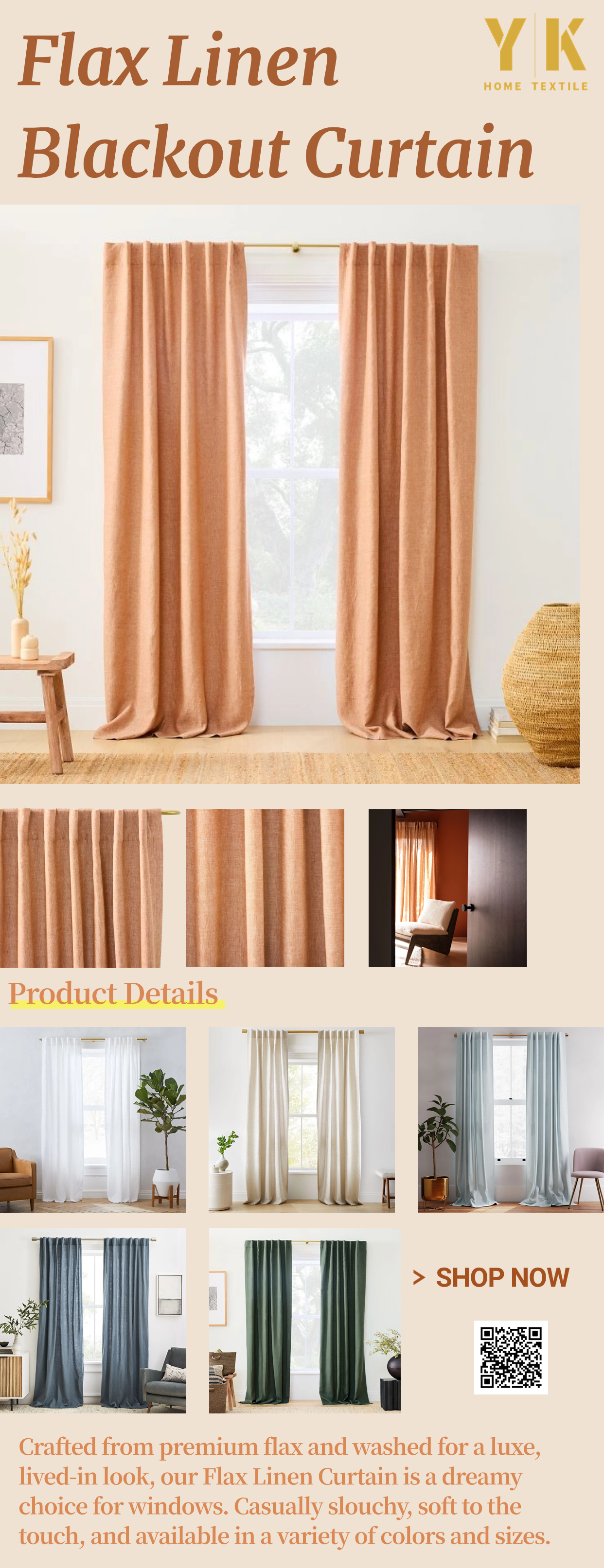리넨: 리넨은 내구성과 우아한 외관으로 유명한 천연 원단입니다. 질감이 있고 약간 소박한 외관을 가지고 있어 방에 세련미를 더해줍니다. 리넨 커튼은 상쾌하고 통풍이 잘되는 분위기를 조성하는 데 인기가 있습니다.